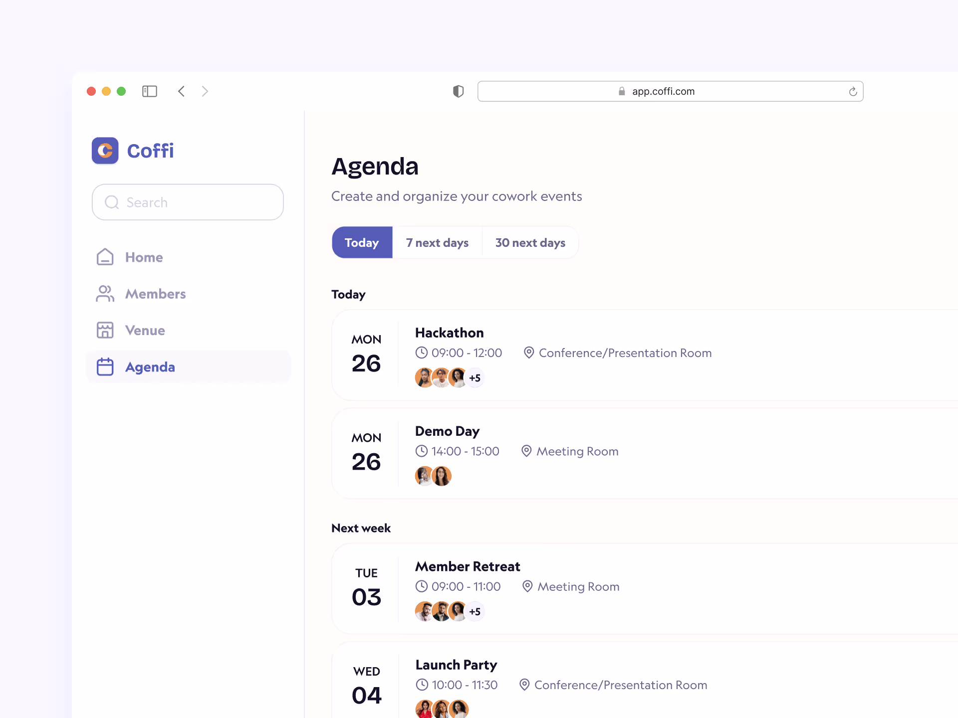Finally, to make a coworking space more than a collection of desks, a manager often organizes events and trainings for the members. A lot of different tools were used, which led to some friction in communication, so we added an Agenda in Coffi.